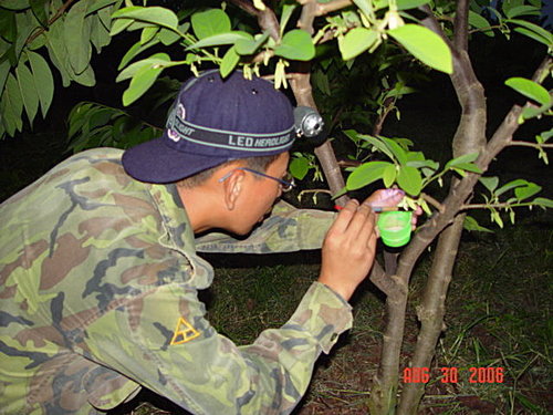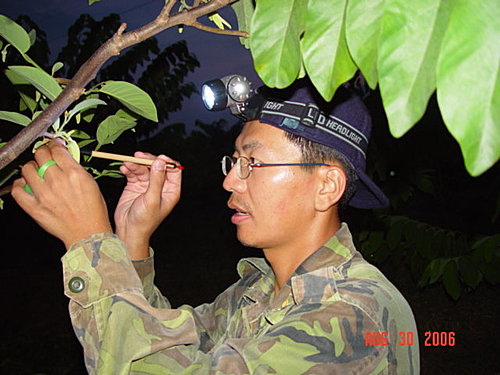 園主-ㄚ揚正在人工授粉,臉上還有被蚊子親到的痕跡喔!
